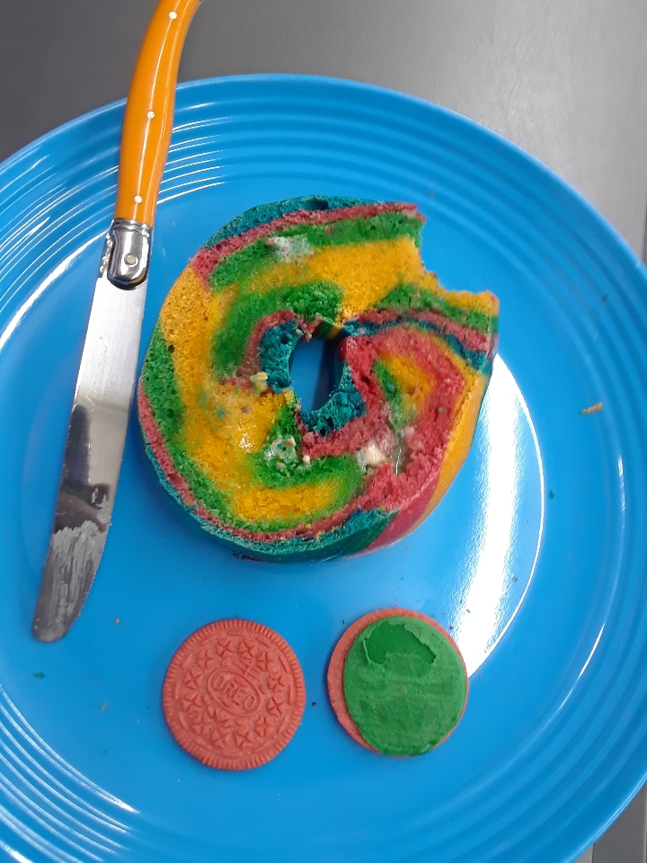 I would have called them tie-dye bagels myself, or maybe used the phrasing I apply to doughnuts with assorted hues and sprinkles on their tops: disco. Whichever, I have to say I have rarely seen anything like a rainbow bagel. It left technicolor crumbs on my knife and the plate, but once again the color was all for show, and the substance of the flavor was . . . really quite good. A basic plain bagel, much softer than my local acquisitions which are all made with sourdough starter. I will probably keep eating my local bagels to support both the breadmaker and my local grocer, but if I chanced upon some disco rainbow bagels, I would buy them.