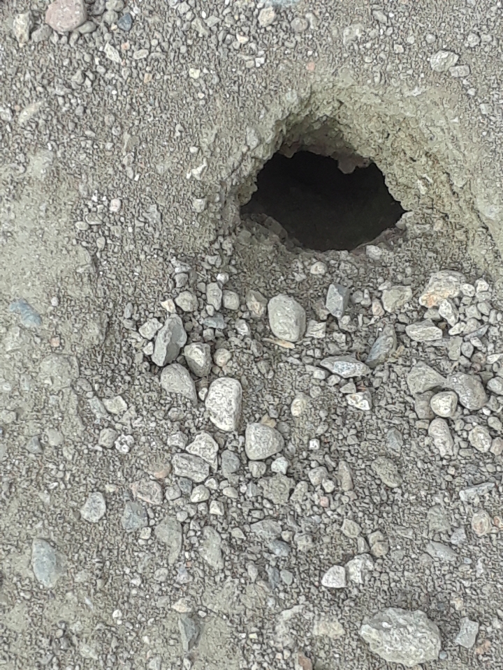 There is a hole in the ground, out here at Riverwalk. Well, I’m sure there are lots of holes, but this one seems notable despite its small size. It’s in the middle of Riverwalk Drive.