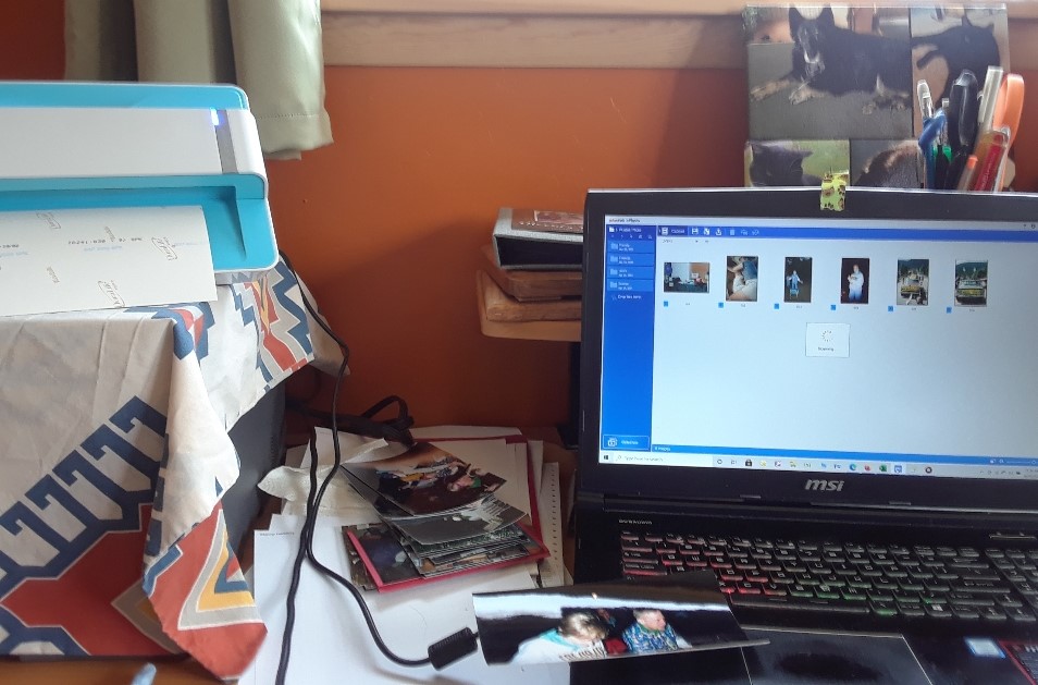 Then I read a suggestion to use your phone to take pictures of your pictures. That means setting out photos one by one, taking a picture, making sure it’s not blurry (although yesterday a local photographer offered tips for better cellphone pics, and one of the tips was to use the “up” volume button to snap the shot. That’s already come in handy), and then transferring it from my phone to my computer. This didn’t seem like it would happen either.
