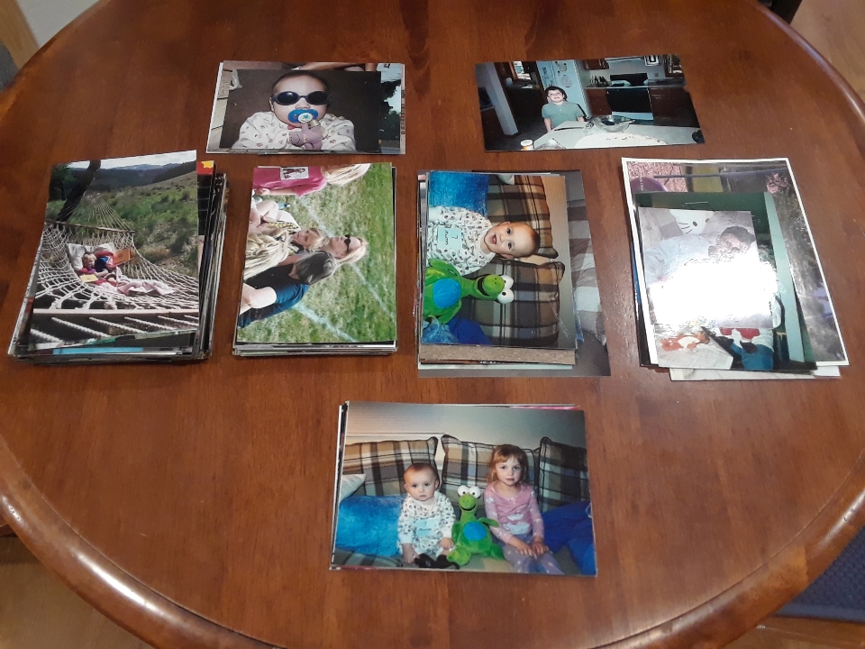 The still-large pile next to it consists of photos of Ellie with family members, also pretty much limited to a span of three-four years. The next pile, notably smaller, is her younger brother Justin, also pictured pretty much in his infancy, including the right-hand pile, which is pictures of Justin with family members. Pictures of the two of them together, a few of these as they aged, are in front.