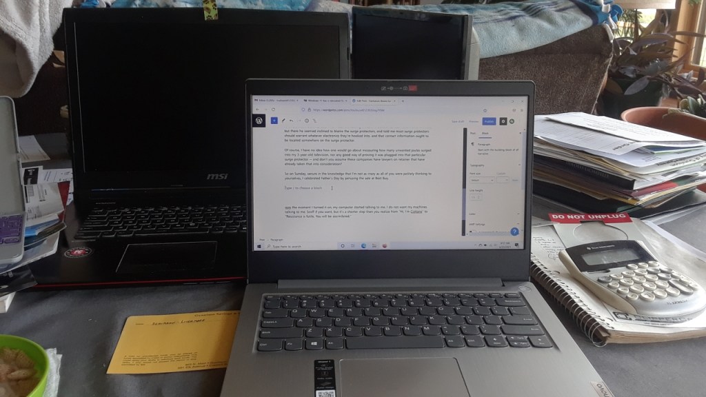 I figured out how to dispatch with Cortana, or at least to keep her from talking to me, and I doubt I got rid of Alexa, which I also thought I was specifically NOT purchasing, but at least she’s out of sight. I removed the Microsoft Store and a whole bunch of other Microsoft crap off my start bar, got the hell out of S Mode as fast as possible, and went back to my friends at Mozilla, even though the computer keeps trying to encourage me to go back to defaulting to Edge. That’s the sort of default that could drive me right over the Edge, don’t they understand that?