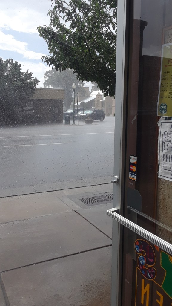 Not a deluge, but regular afternoon rains that, while not gully-washers, a couple of times rated as gutter-washers, filling and overflowing them, occasionally carrying on into the night. It’s the Colorado version of the monsoons, a month early so hopefully this is just a preview and not all we get but we’ll take whatever Mother Nature will offer up these days.