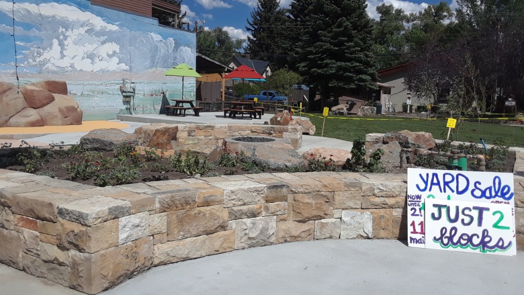 The water feature already needs repair, water running down the stone wall rather than its intended channel, but there are fake rocks and real rocks, bright umbrellas and an extremely elaborate firepit. Best of all: a request for proposals went out for a new mural. Looking at the fake rocks up against the wall, it seems like something depicting Hartman Rocks might be appropriate, but we know what happens to my eminently sensible suggestions.