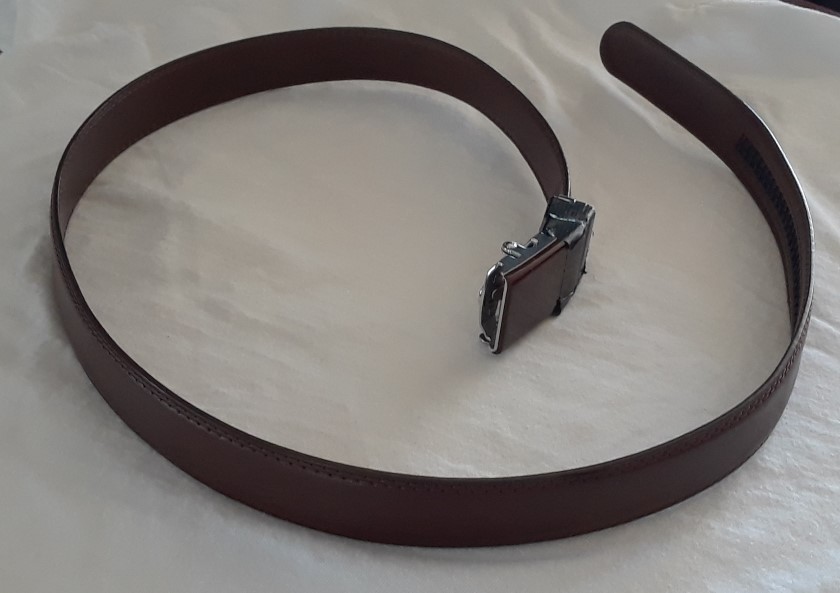 The first time Lynn bought me a click belt, a belt that provides quarter-inch adjustments rather than inch intervals, it arrived in pieces. It wasn’t a belt; it was a belt kit you were supposed to assemble yourself with only the aid of four badly-drawn pictures on the underside of the box. It went back to the company, whose name I can’t recall, and I left a negative review. In retrospect, there wasn’t anything wrong with the belt’s components, all of which were quite attractive, but I wanted a belt, not a do-it-yourself project.