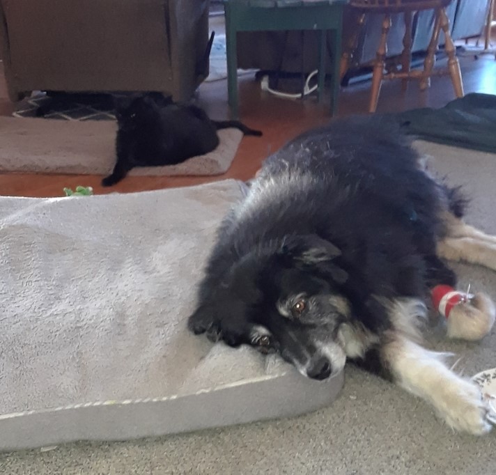 Through the mercies of others — Lynn’s boss went to Almont so she could come home, while Kara, dealing with her own pet loss that same morning, gave me strict orders to stay home — we were both right there with him, along with the cats. Ki’o, who’d kept watch next to me most of the night, crawled between Lynn and me, while Marrakesh prowled on the far side of the water dishes where Oz had called a halt after a last trip outside around 4:30.