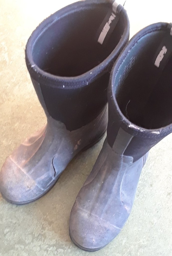 The Muck Boot came with a sturdier (heavier) sole and no thoughtless finger holes designed to fill your boots with rain or snow, so I bought those and have worn them all over our less-than-hundred-acre wood, irrigating, shoveling, just gamboling about. . . And now, years later, they have cracks.