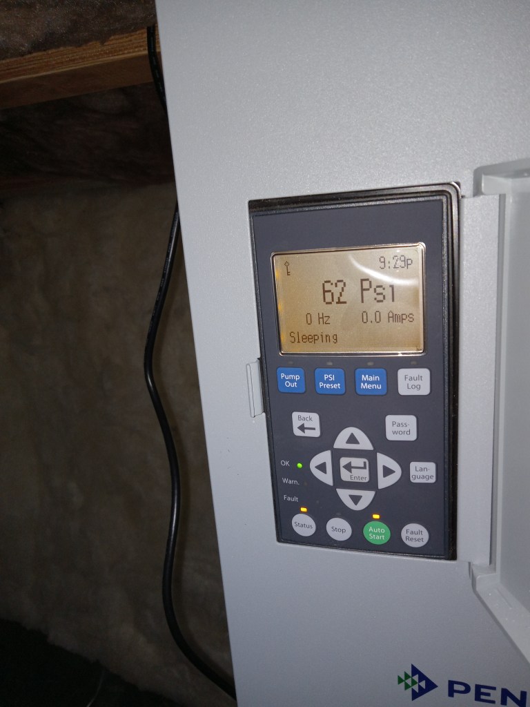 The depressing list goes on, although we hadn’t heard “Never seen that before” for awhile. Not until the well guys showed up Monday right when they said they would, went down in our crawlspace and confronted a frozen screen on the controller: “We’ve never seen this before. We’ve never even heard of this happening.”