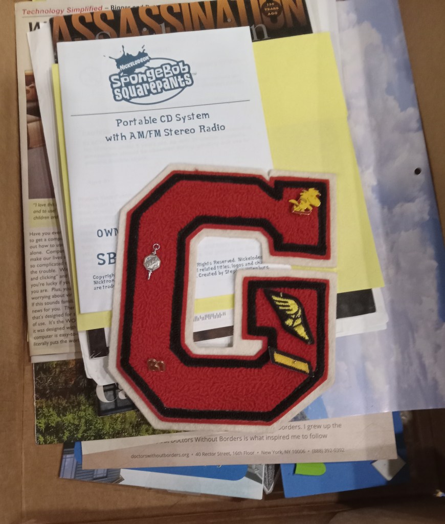 Now, the one I have opened for this month started with papers dated 2021, so you might think I could chuck that one. But, over a quarter of the way in — look at me go! and only on Day Two — I found my high school letter, and I know you don’t care about it, but I’d like to keep it.